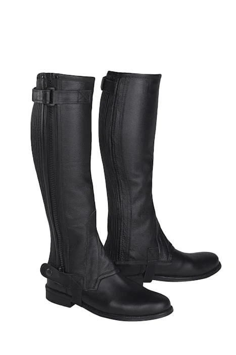 Wewnętrzna strona czapsów zapewnia dobrą przyczepność do bryczesów, co zapobiega przesuwaniu się nogi i poprawia kontrolę w siodle. Elastyczna, szeroka wstawka przy zamku sprawia, że czapsy idealnie dopasowują się do łydki i są wygodne w użytkowaniu.