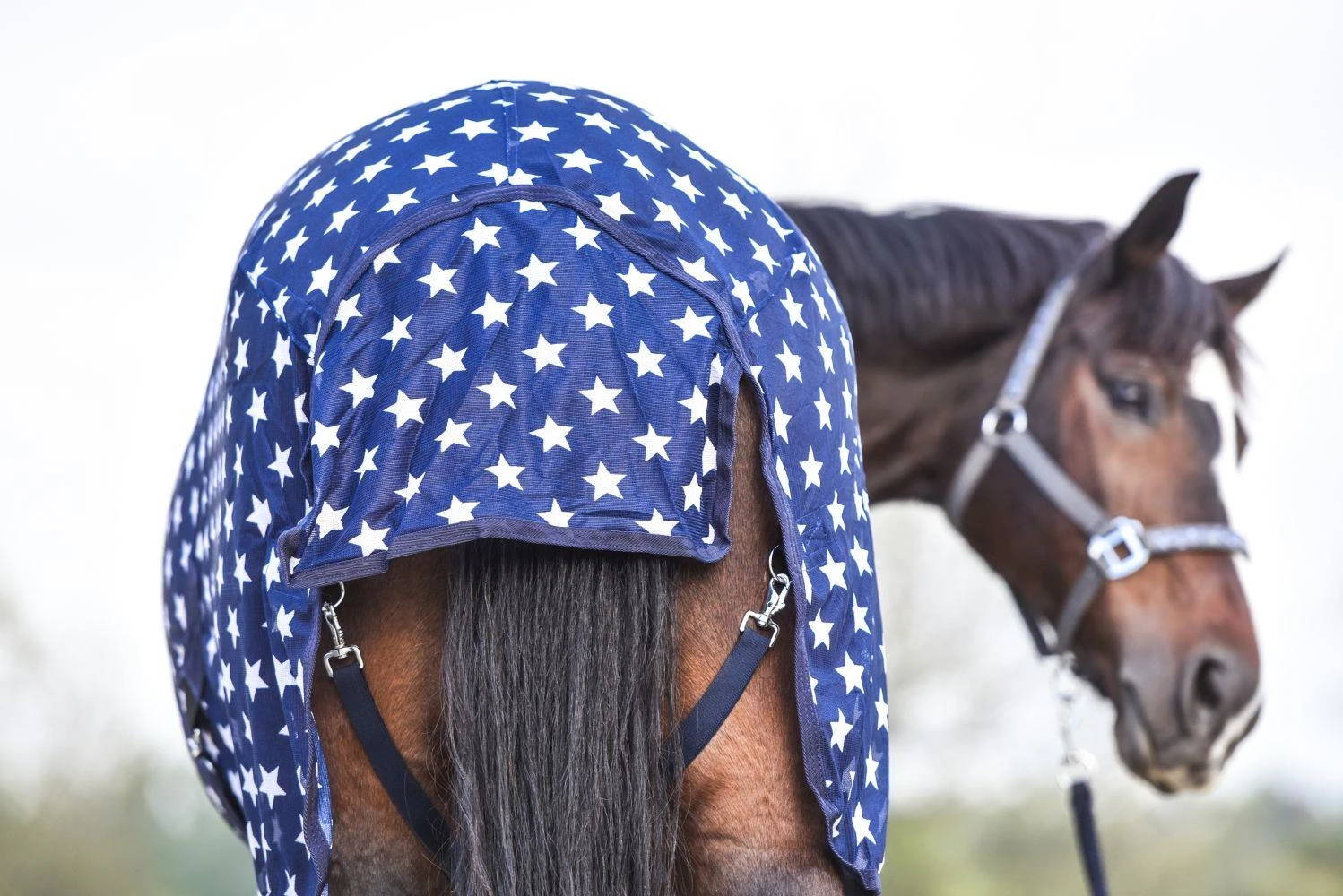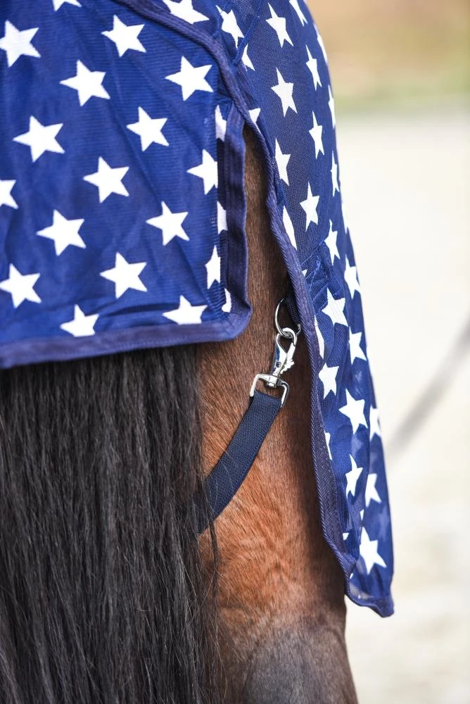 ✔ skuteczna ochrona przed owadami, także przed drobnymi meszkami ✔ drobna siatka zapewniająca dobrą cyrkulację powietrza ✔ lekki i przewiewny materiał idealny na ciepłe dni ✔ modny wzór w gwiazdki, który wyróżnia konia na padoku ✔ doskonała zarówno na padok, jak i do stajni