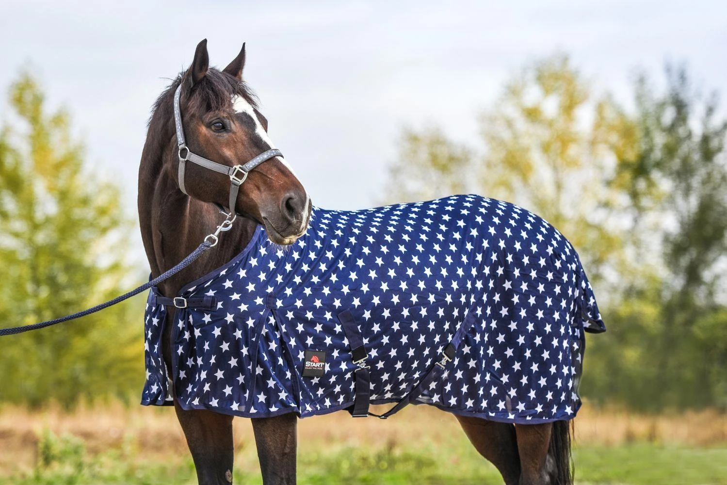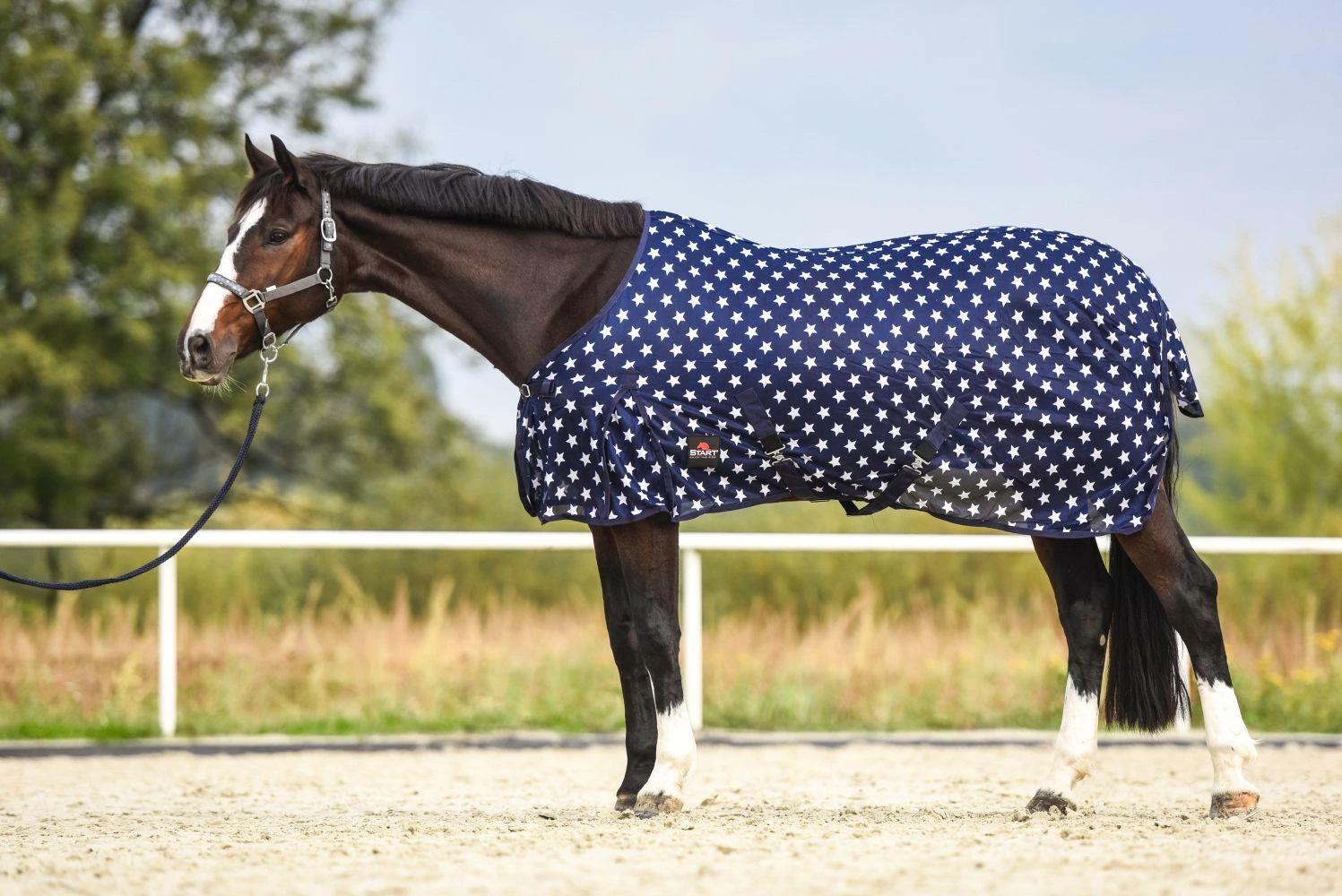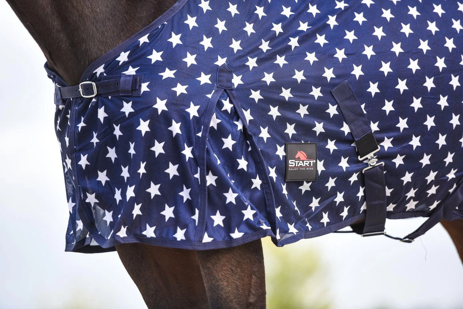 Derka przeciw owadom START Stars to lekka i przewiewna derka siatkowa zaprojektowana, aby skutecznie chronić konia przed muchami, komarami oraz drobnymi owadami, takimi jak meszki. Dzięki drobnej strukturze siatki zapewnia wysoki poziom ochrony, jednocześnie umożliwiając dobrą cyrkulację powietrza i komfort noszenia.