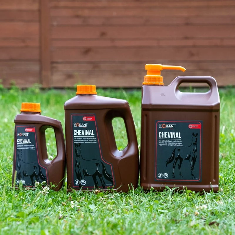 Foran Chevinal to wysokiej jakości suplement witaminowy w płynie, stworzony z myślą o codziennym uzupełnianiu diety koni. Zawiera bogaty zestaw witamin (A, D3, E, K, z grupy B), minerałów oraz niezbędnych aminokwasów, które wspierają zdrowie, wydolność i ogólną kondycję organizmu.