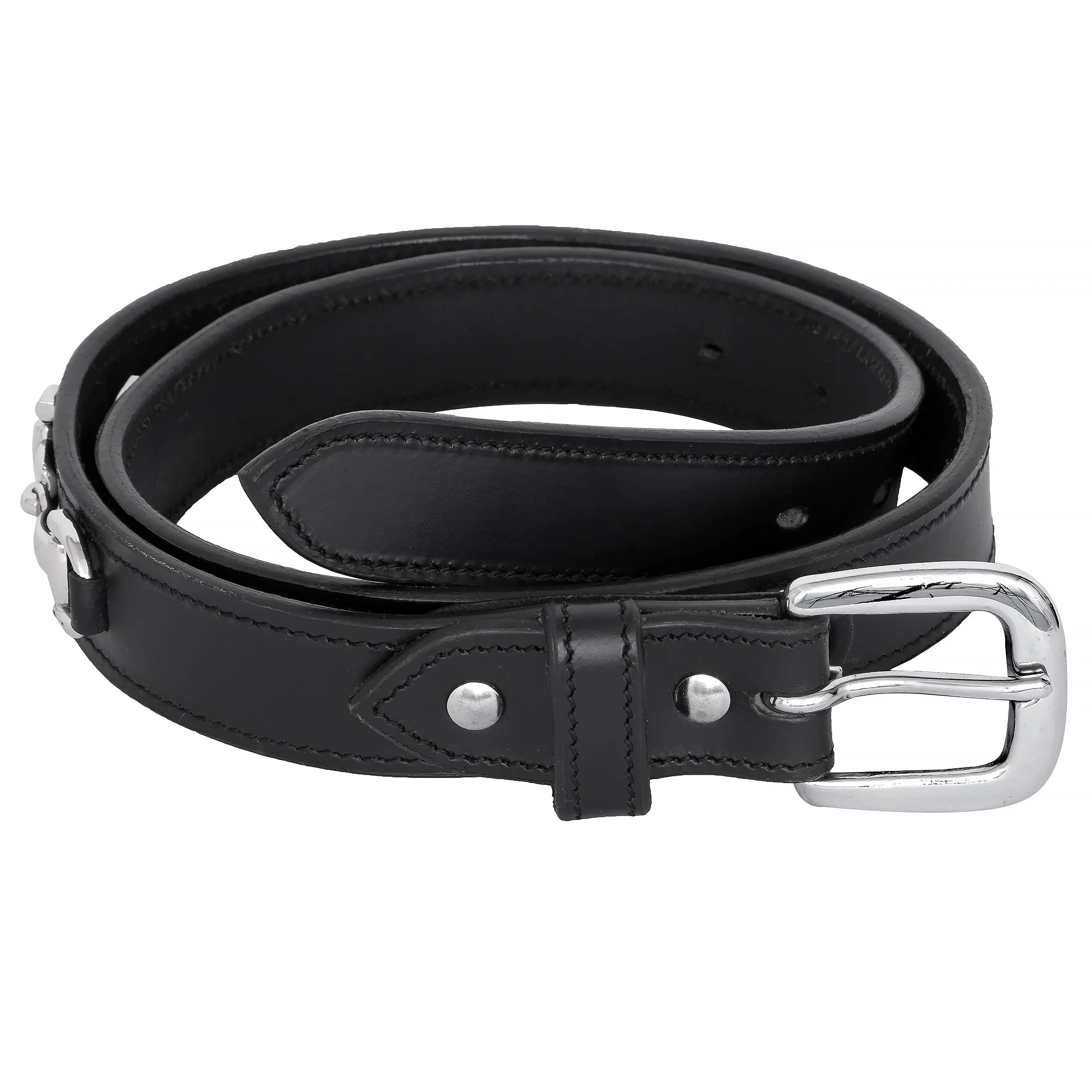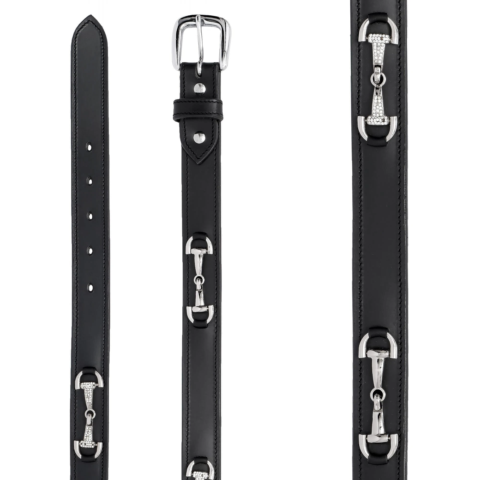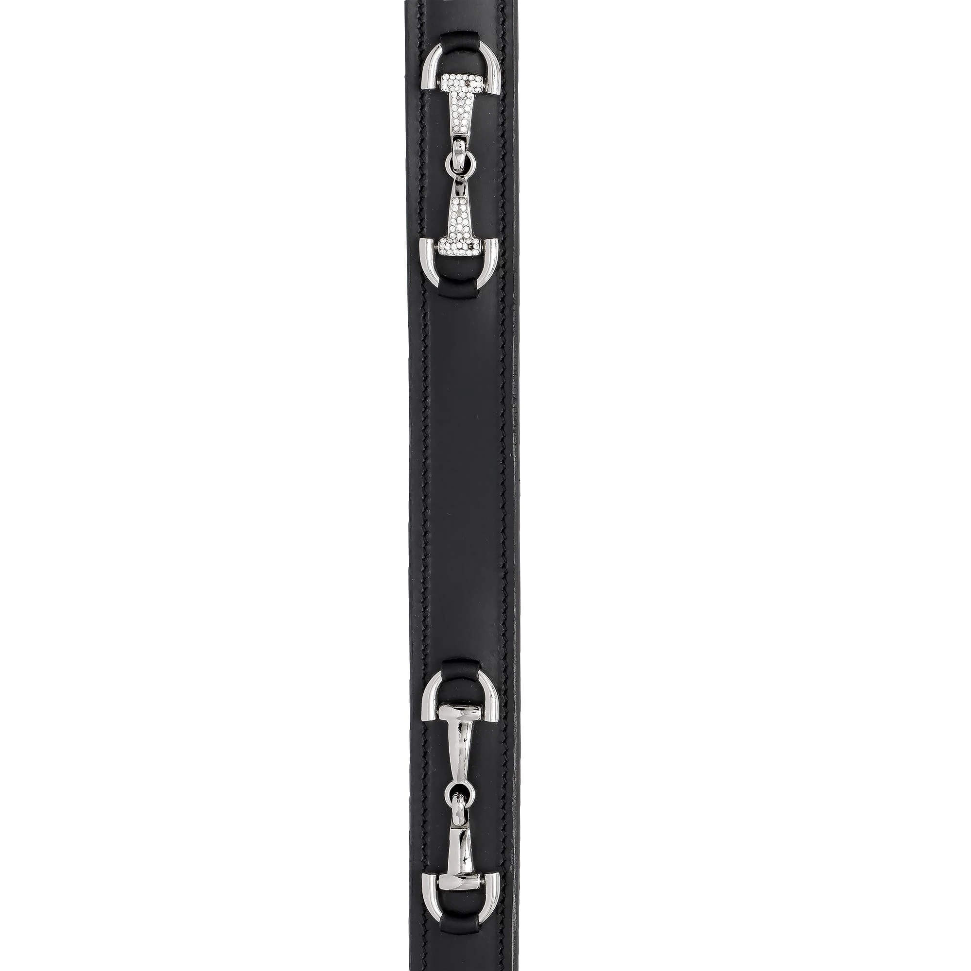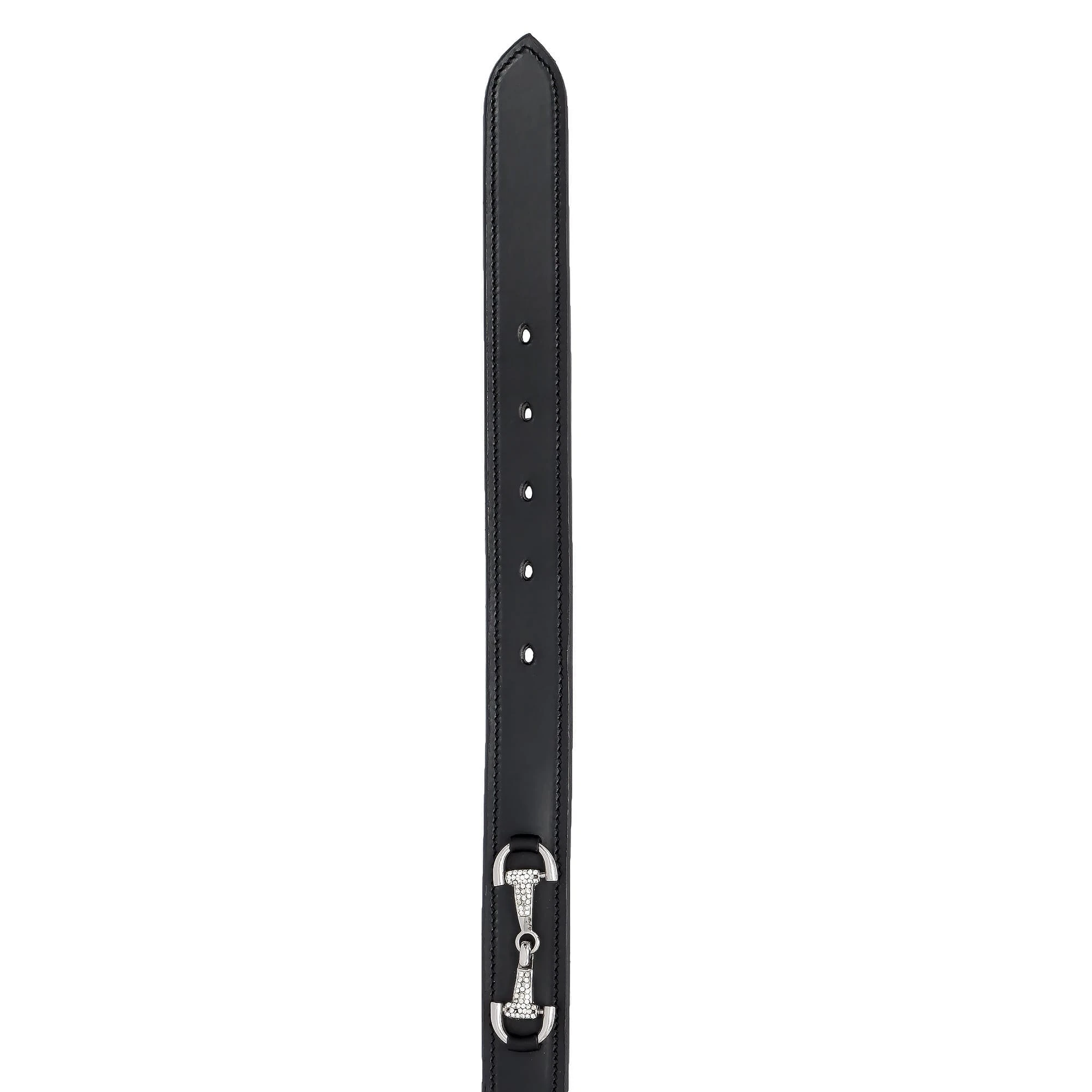 Model wyróżnia się ozdobnym motywem wędzidła, który został delikatnie wysadzany kryształkami, nadając całości subtelnego blasku. Srebrne okucia podkreślają klasyczny charakter paska, dzięki czemu pasuje zarówno do stylizacji stajennych, jak i codziennych.